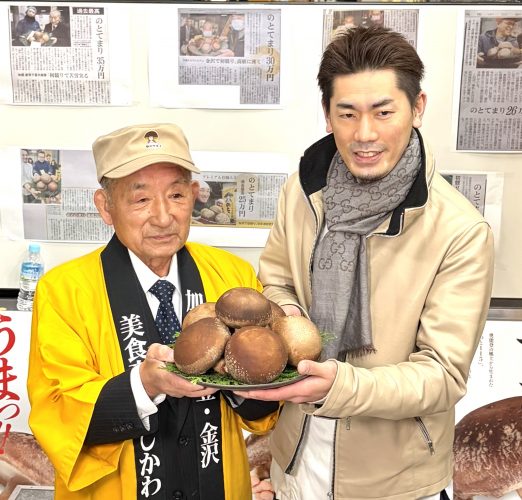 【写真 のとてまりプレミアムと樋下会長(左)、杉山氏(右)】本日、原木椎茸「のと115」の特秀品である「のとてまり」の初入荷を迎えました。初せりに先立ちセレモニーが行われ、吉田農林水産部長より「厳しい生産環境の中で、風味と香りが良いのとてまりを出荷することが出来ました。市場関係者の皆様には高い評価をお願いします。」、奥能登原木しいたけ活性化協議会の樋下会長より「今年で15回目の初せりを迎えました。風味や香り、歯切れの良い食感に仕上がり、地震や豪雨に被災した生産者が復興の最中、精根を込めて作りました。仲卸の皆様には是非とも高い評価をお願いします。」との挨拶をいただきました。初せりの最後にはプレミアムの6玉入がせりにかけられ、30万円でせり落とされました。去年に続き、今年も㈱堀他が購入し、金沢にあるリストランテスギヤマに納品されました。杉山氏からは「のとてまりは毎年使っており、今年はパスタや火を入れて食感や素材そのものの味を楽しんでもらえる様な料理を提供したい。」、樋下会長からは「想いを込めて一生懸命作ったのとてまりを評価いただき良かったです。」とのコメントをいただきました。