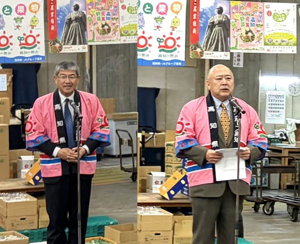 写真 挨拶をする桑名市長(左)と長山常務(右)】本日、高知県より高知市桑名市長、JA高知県をはじめ関係者が来場され、高知県青果物のトップセールスが行われました。トップセールスでは、桑名市長より「産地としての務めをしっかり果たしていきたいと思いますので、これからも高知のおいしい野菜、果物をよろしくお願いします」、長山常務より「市場の現場での生の声をうかがいました。今後の出荷計画や品質向上に反映させていく所存です。」との挨拶をいただきました。昨日9日には、産地が制定する“よいピーマンの日”にちなみ市内の犀桜小学校でピーマンについての出前授業や村山金沢市長のもとに表敬訪問が行われました。